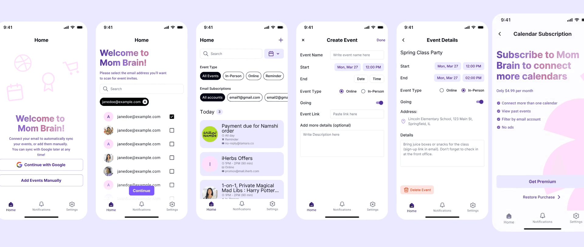 I designed the interface using soft purples, rounded corners, and minimal clutter to communicate warmth, trust, and ease. The gradient tones help soften the typical productivity app aesthetic, making Momezy feel more like a helping hand than a checklist. I chose Roboto for its clean, modern look and excellent readability across devices. Every screen is structured to keep key details—like event time, type, and location—easily scannable, even during life’s busiest moments.